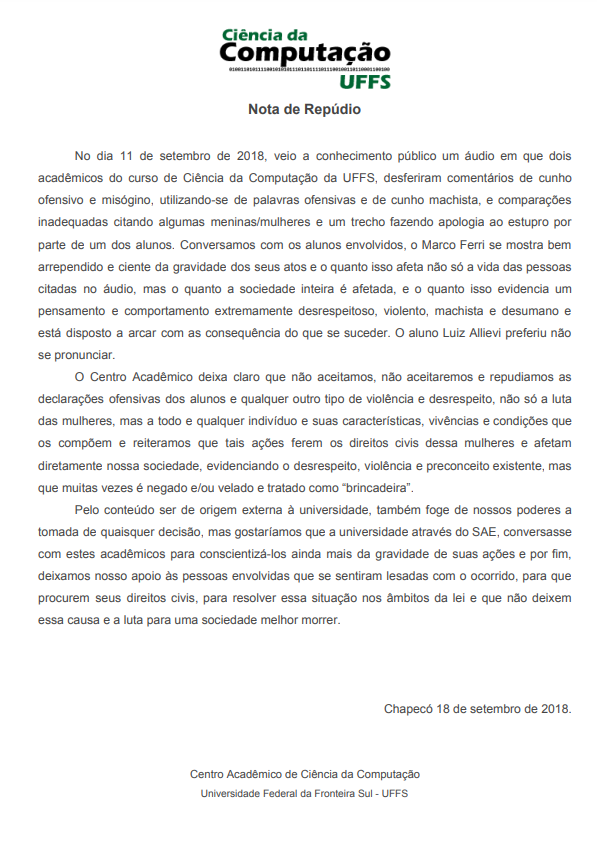 O Cêntro Acadêmico de Ciência da Computação da UFFS se posiciona com relação ao caso de conhecimento público de um podcast envolvendo dois alunos do curso.